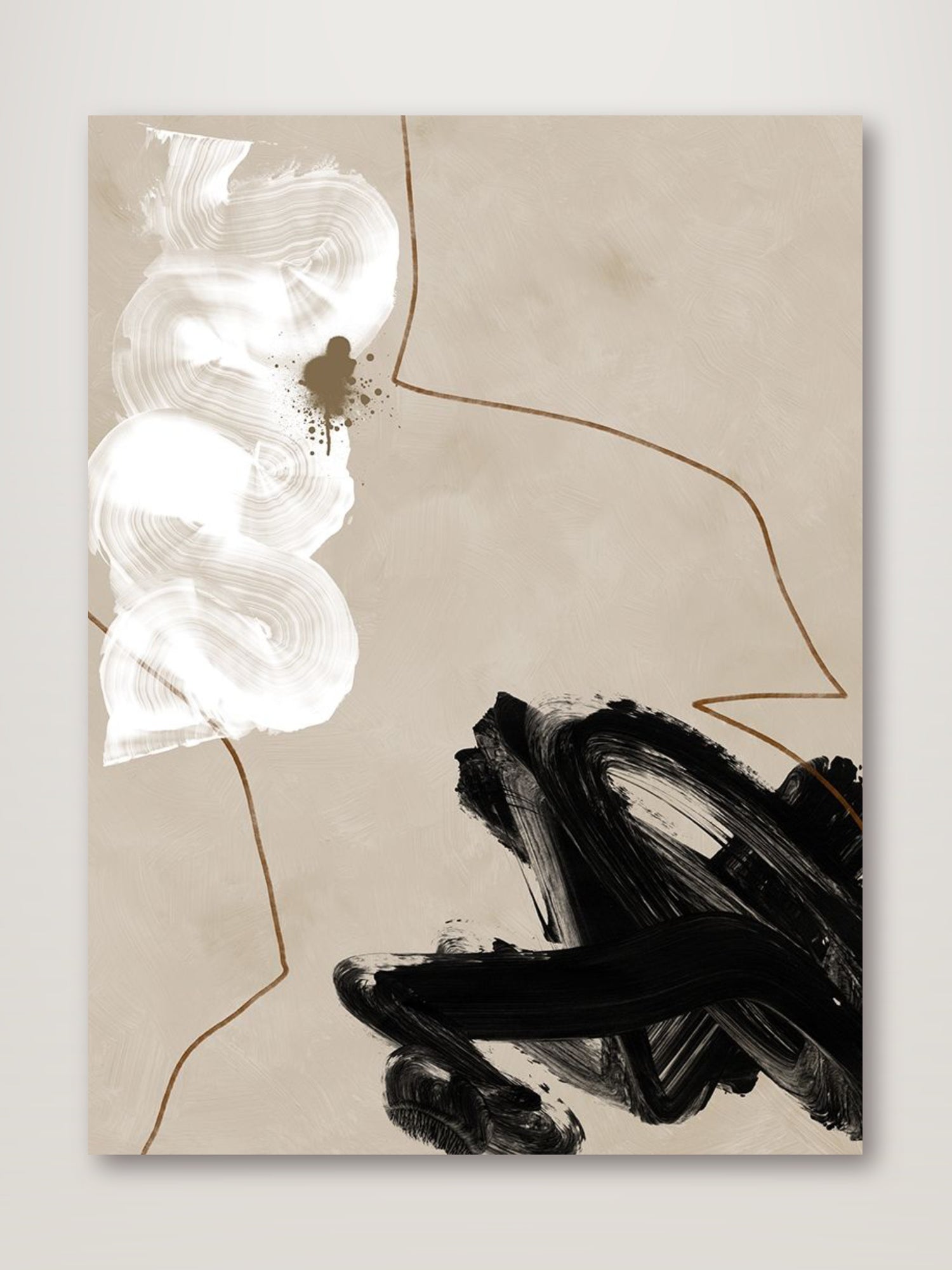 A modern painted abstract art print. This print uses a mixture of line drawings and painted sections to create an intriguing print. It uses a neutral colour palette that can compliment your furniture.